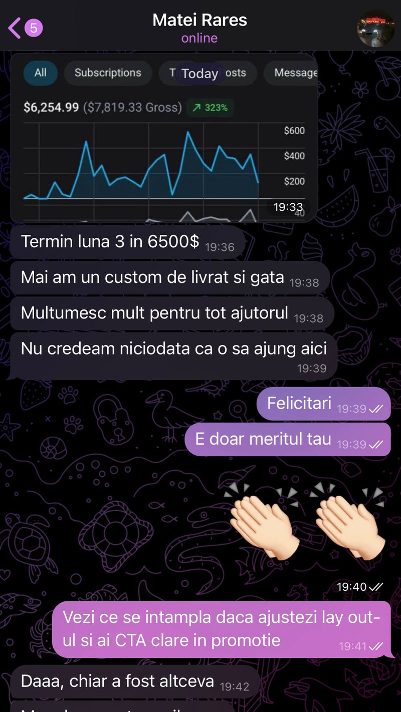 Știm cât de mulți oameni vor să câștige bani online, dar nu știu de unde să înceapă. Unii muncesc zilnic fără progres real, alții abia au terminat școala și nu știu ce direcție să urmeze. Sunt și cei care au încercat deja, dar fără strategie, fără structură, fără rezultate. Așa am înțeles că industria OnlyFans e o oportunitate uriașă, dar doar pentru cei care o tratează ca pe un business. După ani de testări, greșeli și muncă, am creat PaunOFM: un sistem care aduce claritate, strategie și control. Pentru că diferența dintre cei care visează și cei care reușesc este informația corectă.